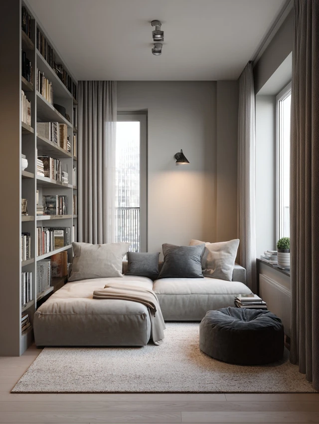 Soft neutrals, whites, and light grays expand visual space.
